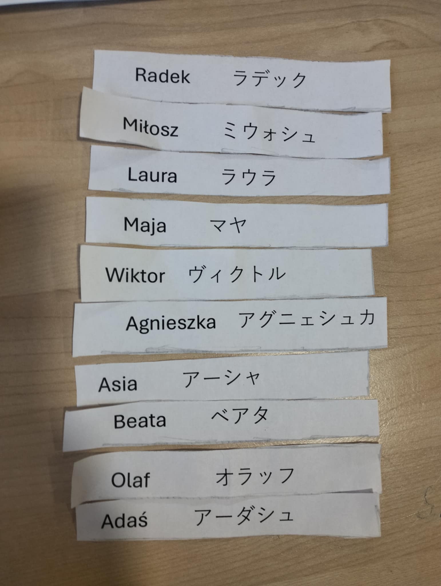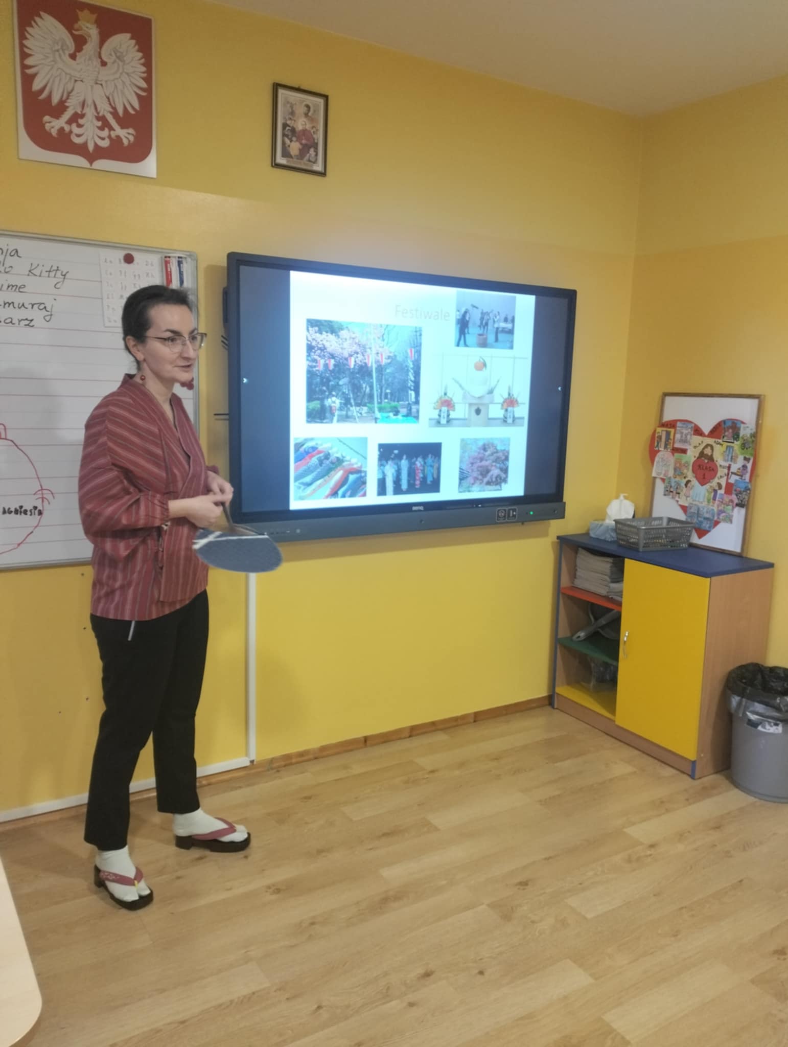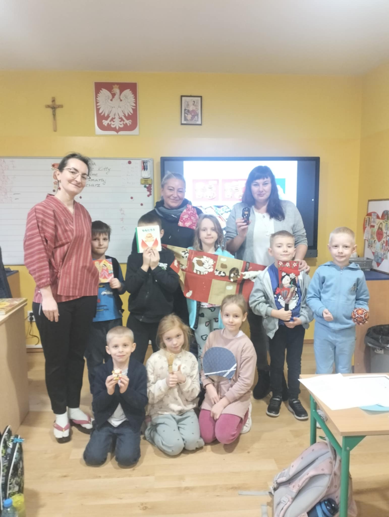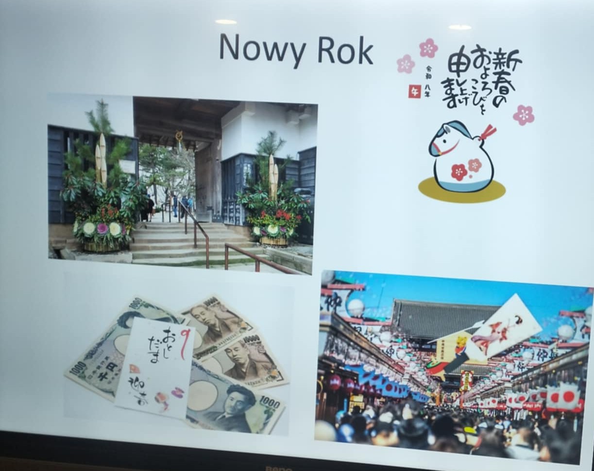 Rozmawialiśmy o symbolach, różnych tradycjach, świętach i japońskich strojach. Nie zabrakło kilku szczegółów na temat japońskich potraw i herbaty matcha. Porównywaliśmy polskie i japońskie podręczniki do I klasy - zgadnijcie, które są łatwiejsze! Uczyliśmy się też pisać swoje imiona po japońsku i śpiewać piosenki świąteczne. Na koniec zagraliśmy w fukuwarai - tradycyjną zabawę noworoczną, która polega na zamknięciu oczu i układaniu na kartce wyciętych z papieru poszczególnych części twarzy. Możecie sobie wyobrazić jakie powstały śmieszne wyklejanki!