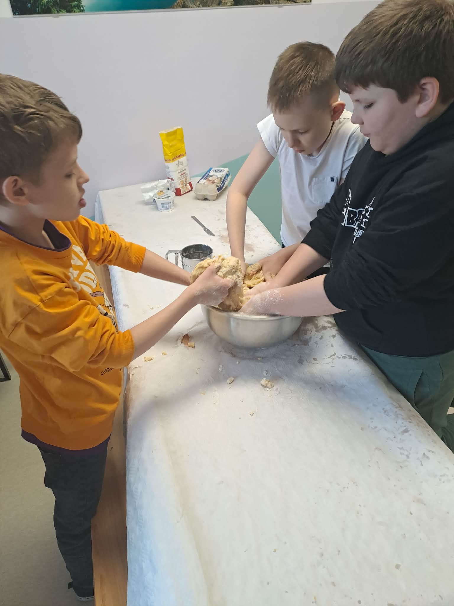 Uczniowie klasy 3 wprowadzili do szkoły wielkanocny nastrój Podczas zajęć wspólnie piekli i dekorowali tradycyjne mazurki.