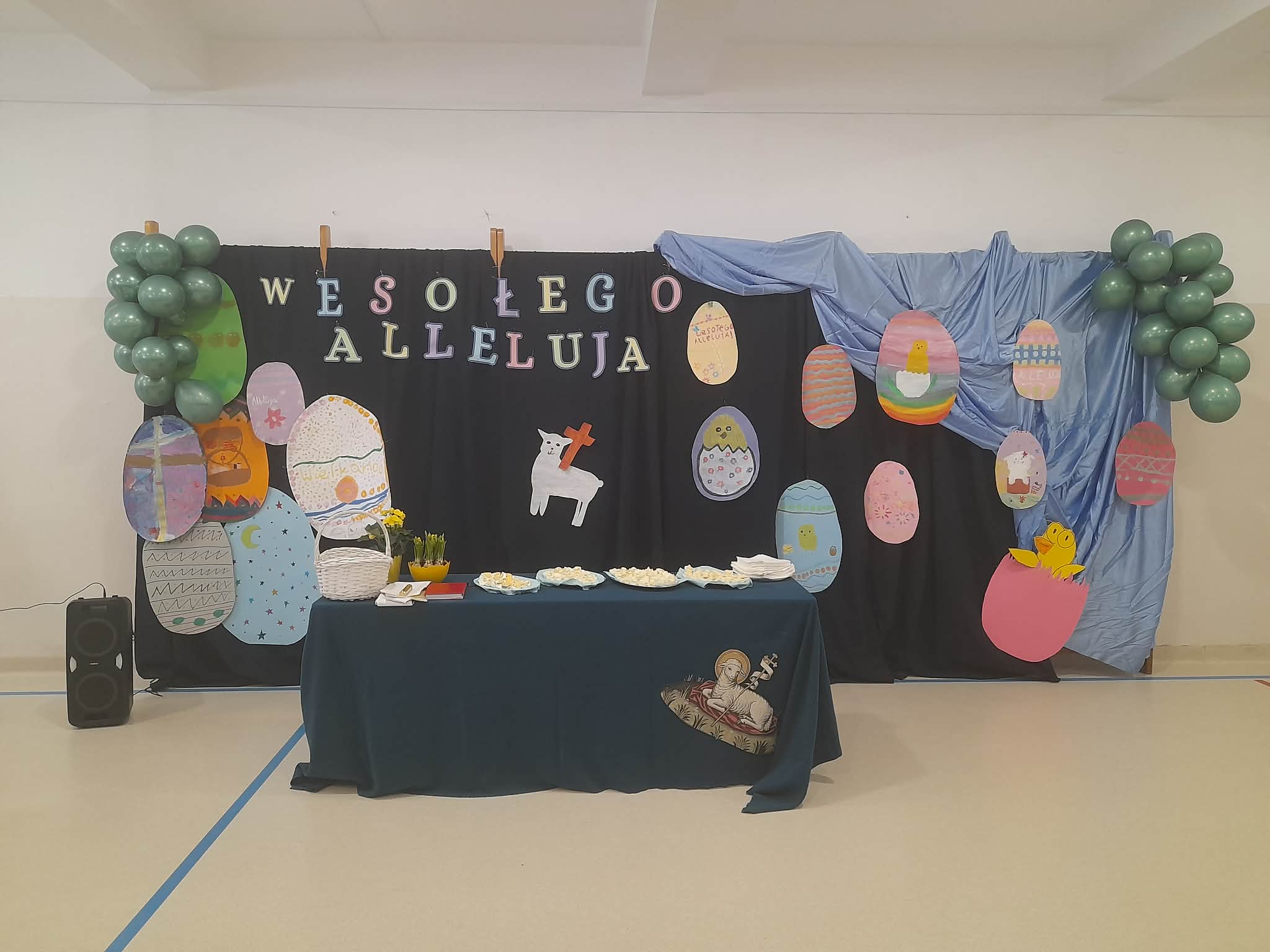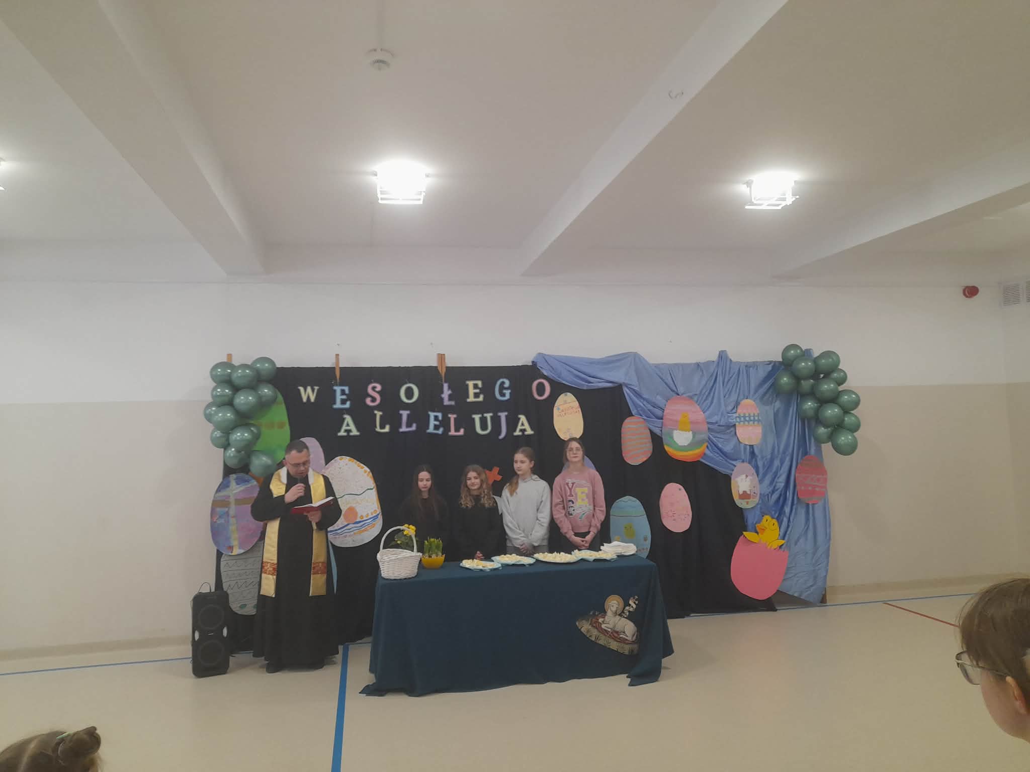 Następnie odbyło się tradycyjne święcenie jajek, które od lat stanowi ważny element naszego wielkanocnego spotkania. Uczniowie wraz z nauczycielami zebrali się, by wspólnie przeżyć ten piękny moment.