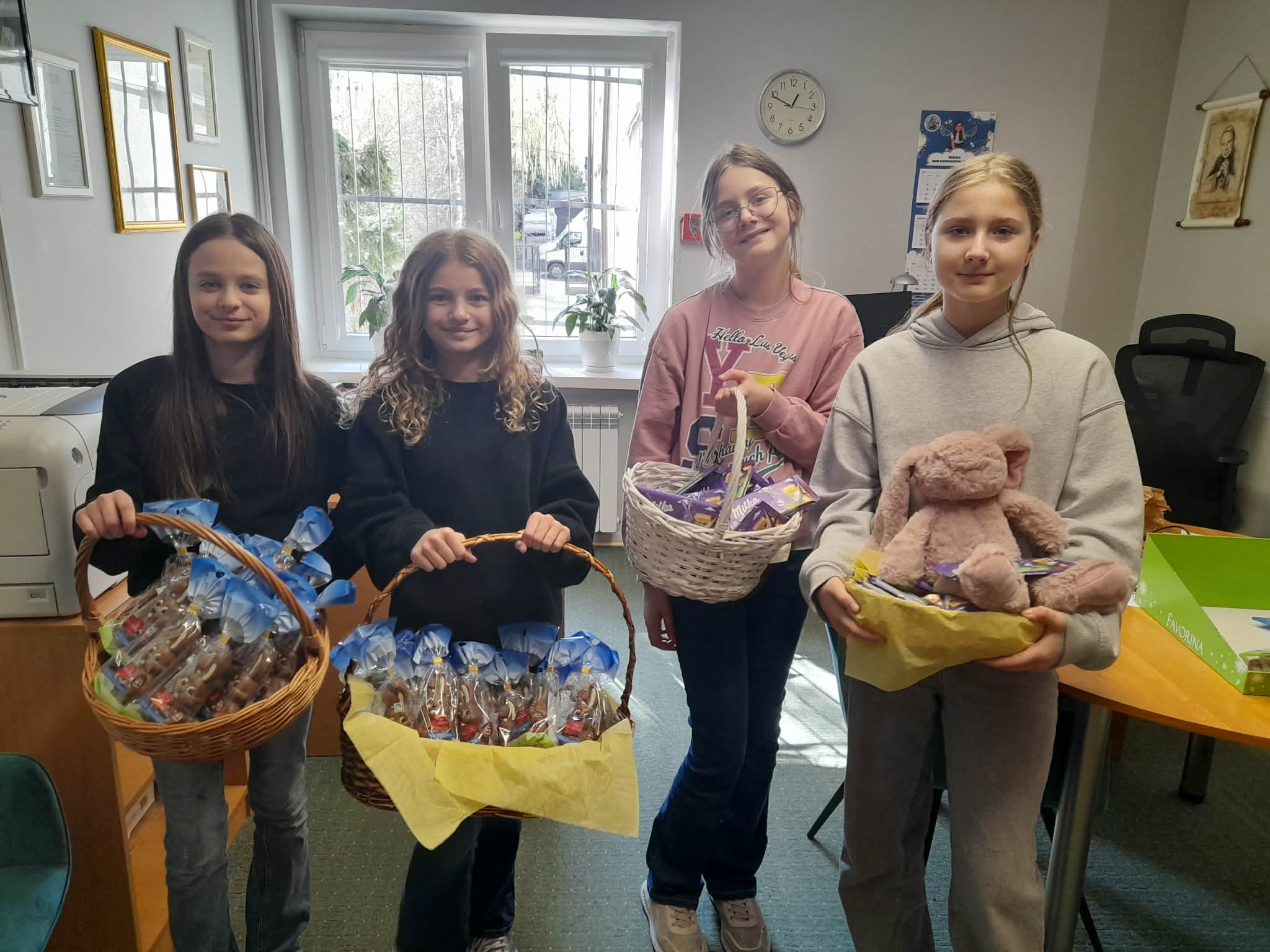 Po uroczystościach każdą klasę odwiedził także króliczek ze swoimi pomocnicami, aby wręczyć uczniom słodkie upominki, wywołując wiele uśmiechów i radości.